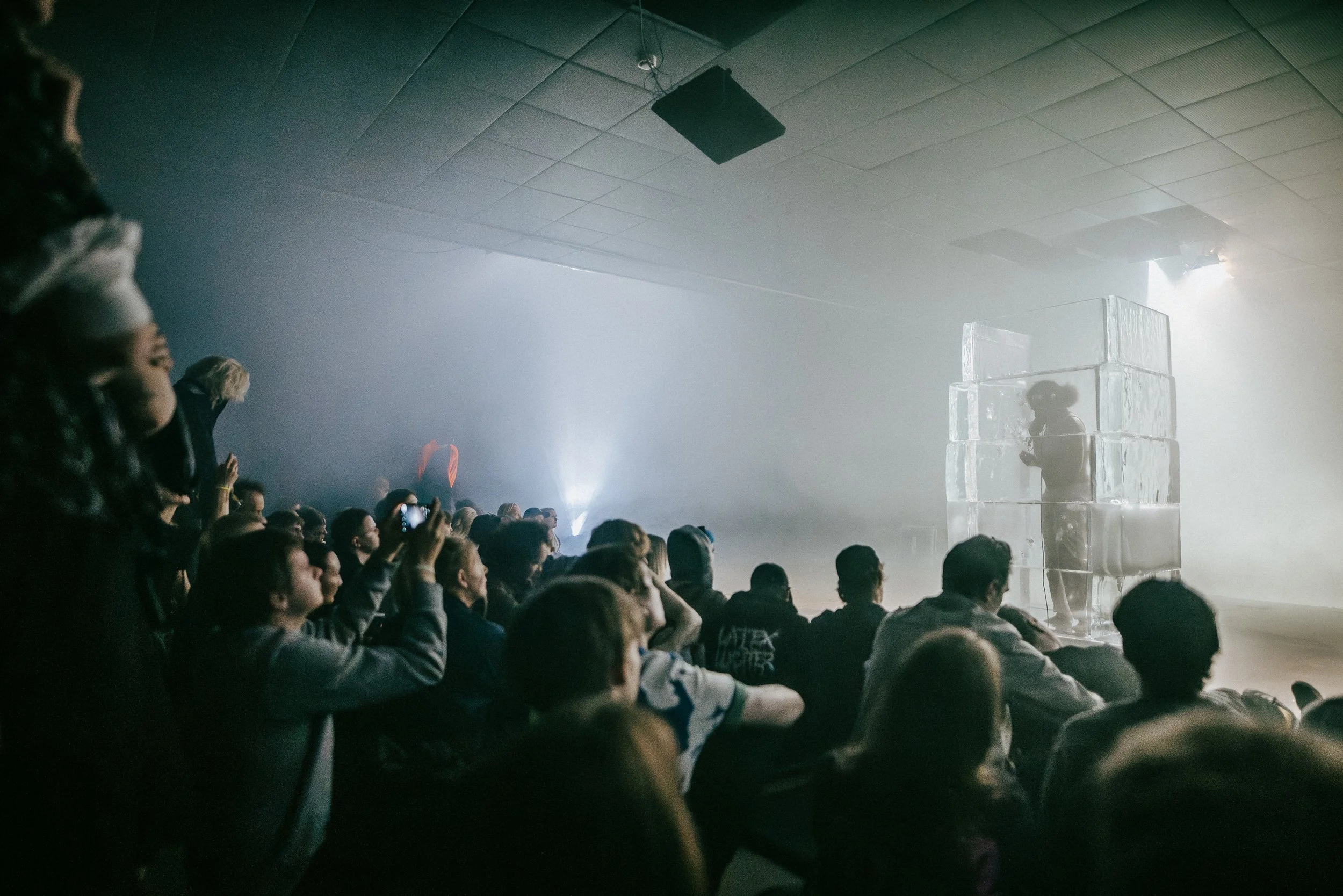 Ecdysis is an audio-visual collaboration between rapper and performer, Iceboy Violet and artist and set designer, Ella Skinner. This piece is performed within an ice sculpture which changes on exposure to heat, light, body and movement. The ice barrier between the performer and audience morphs into a world of dis//embodiment, ir//reality, in//ex//ternality and in//authenticity, between fantasy and reality in which the inner becomes the outer and the exoskeleton is obliterated.