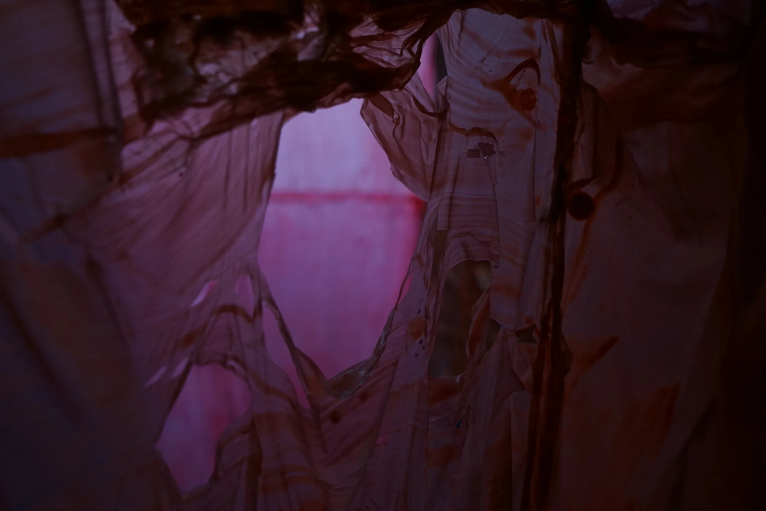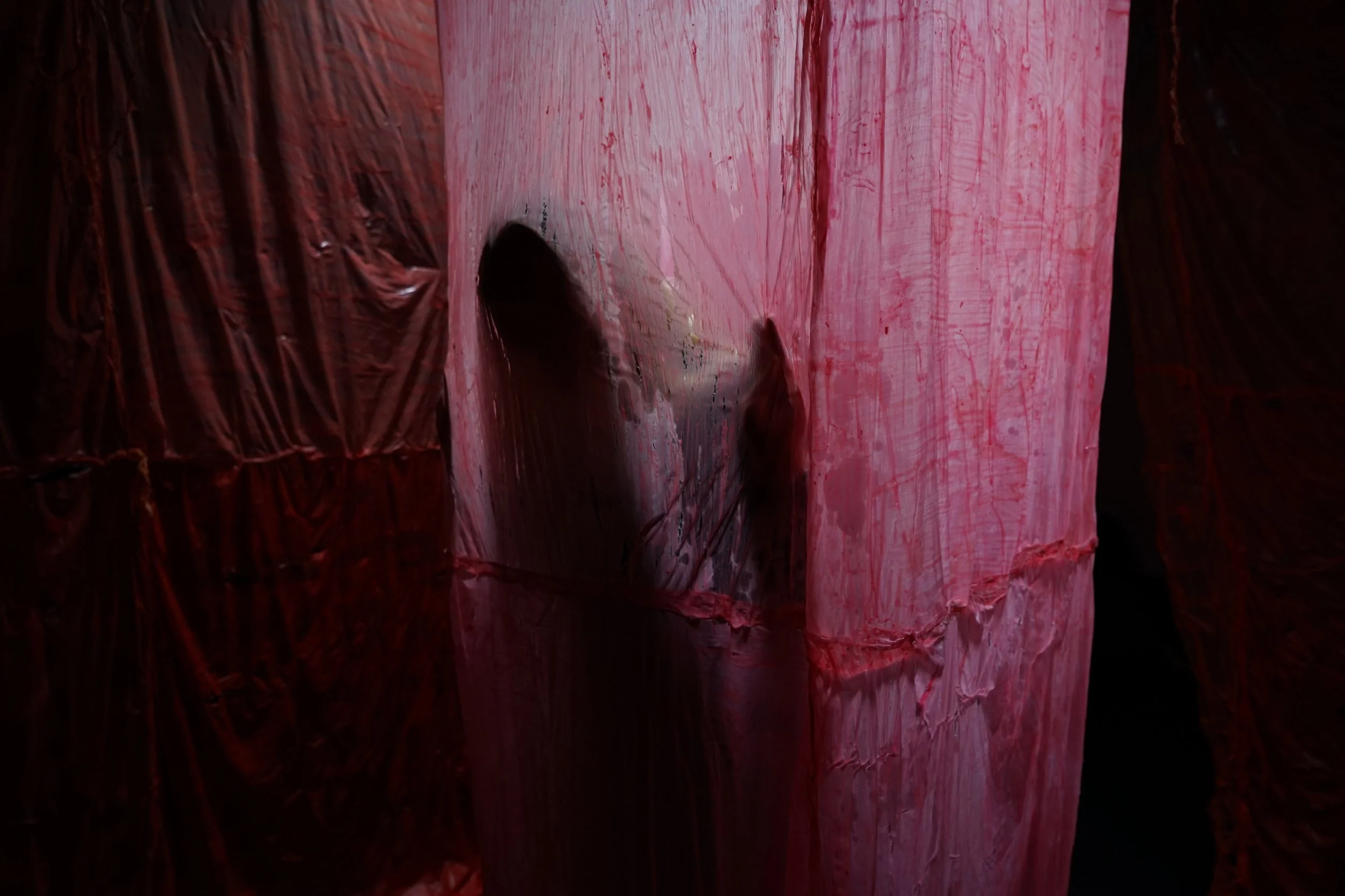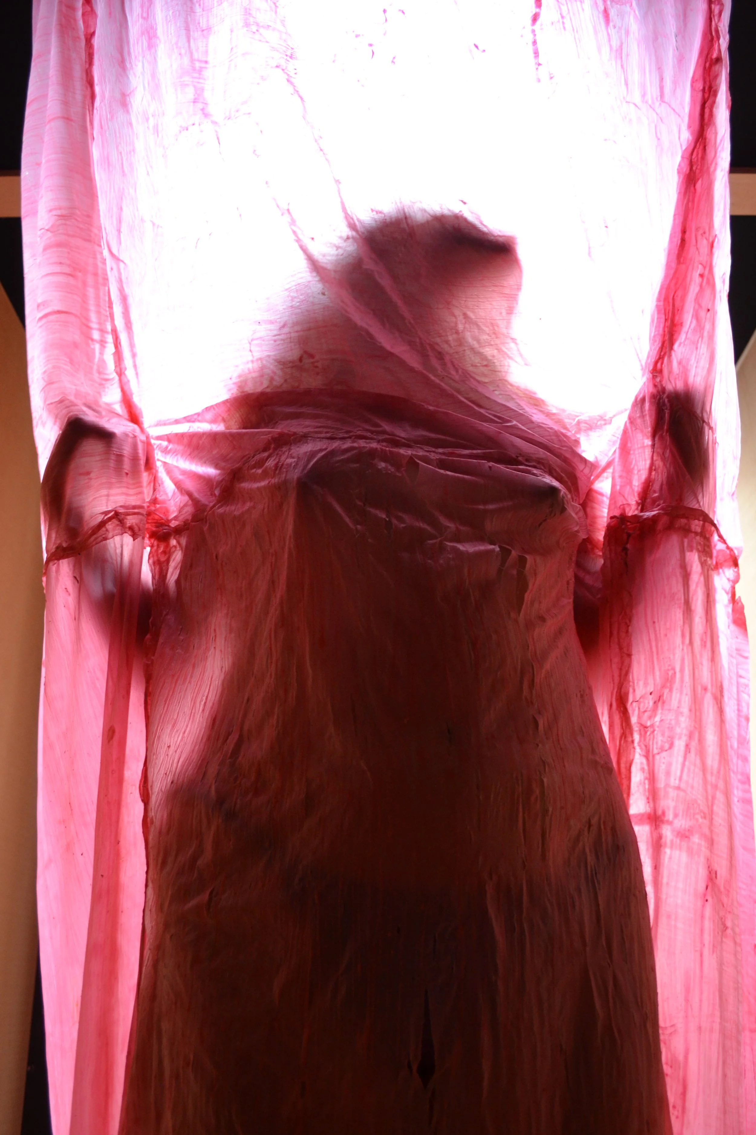 A performer is placed within an inner latex structure and is directed to perform the Catholic ritual of the sign of the cross. However, placed within such a small, suffocating space this ritual becomes frantic and desperate, and the performance develops into a physical state of anxiety, pressure, and pain. The latex structure only reveals the silhouette of the performer, muting their figure, meaning their expression of this experience can only be communicated effectively to the audience through sound. The body of the performer is wired to a contact microphone and distortion pedal set-up so that everything they touch within the structure is met with a loud, jarring sound. The artist Ella Jo Skinner, collaborated with the musician Jack Spittle to create a soundscape that works within the physical boundaries of the installation. Skinner and Spittle recorded a mixture of acoustics, vocals, and basslines whilst locked inside cupboards to emulate the sound of entrapment and isolation. The fragility of the latex or “skin” containing a performer, who sweats and struggles within, perhaps reveals how such a physical and emotional state can be broken through, but our internal anxieties prevent us from doing so, revealing a failure to achieve empathy with others.