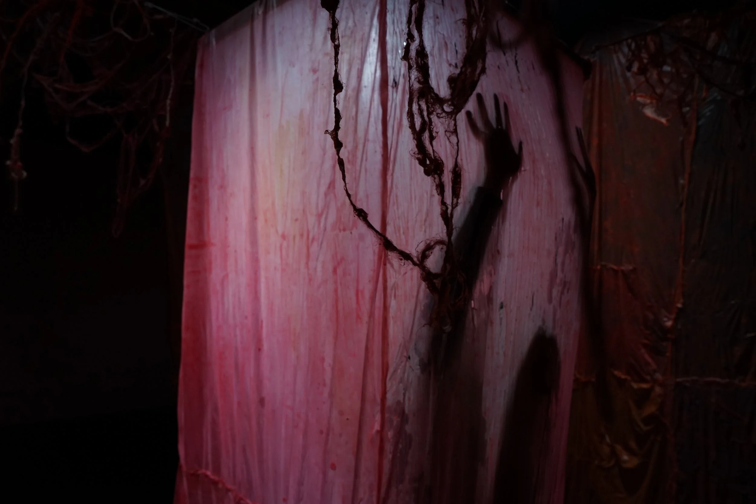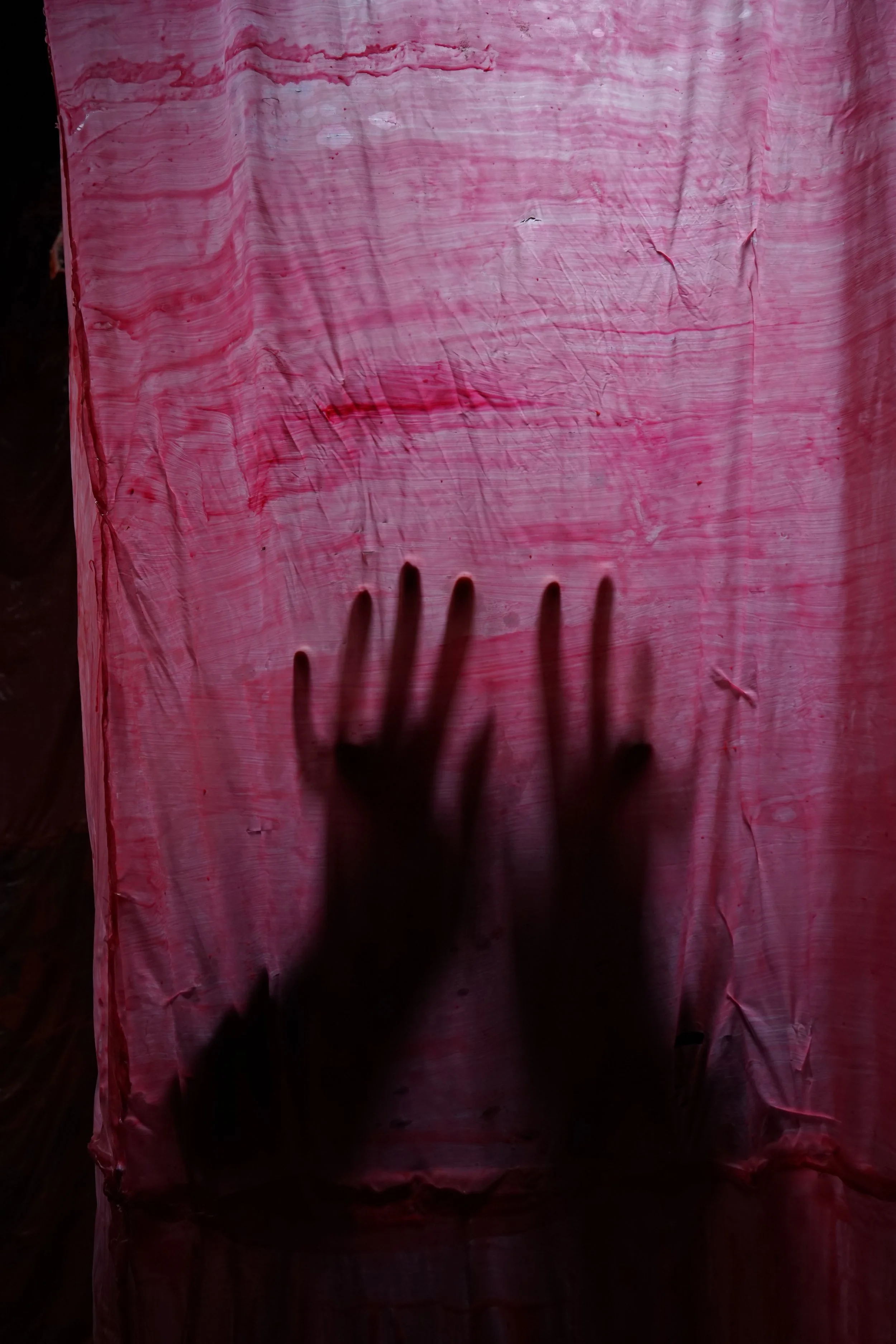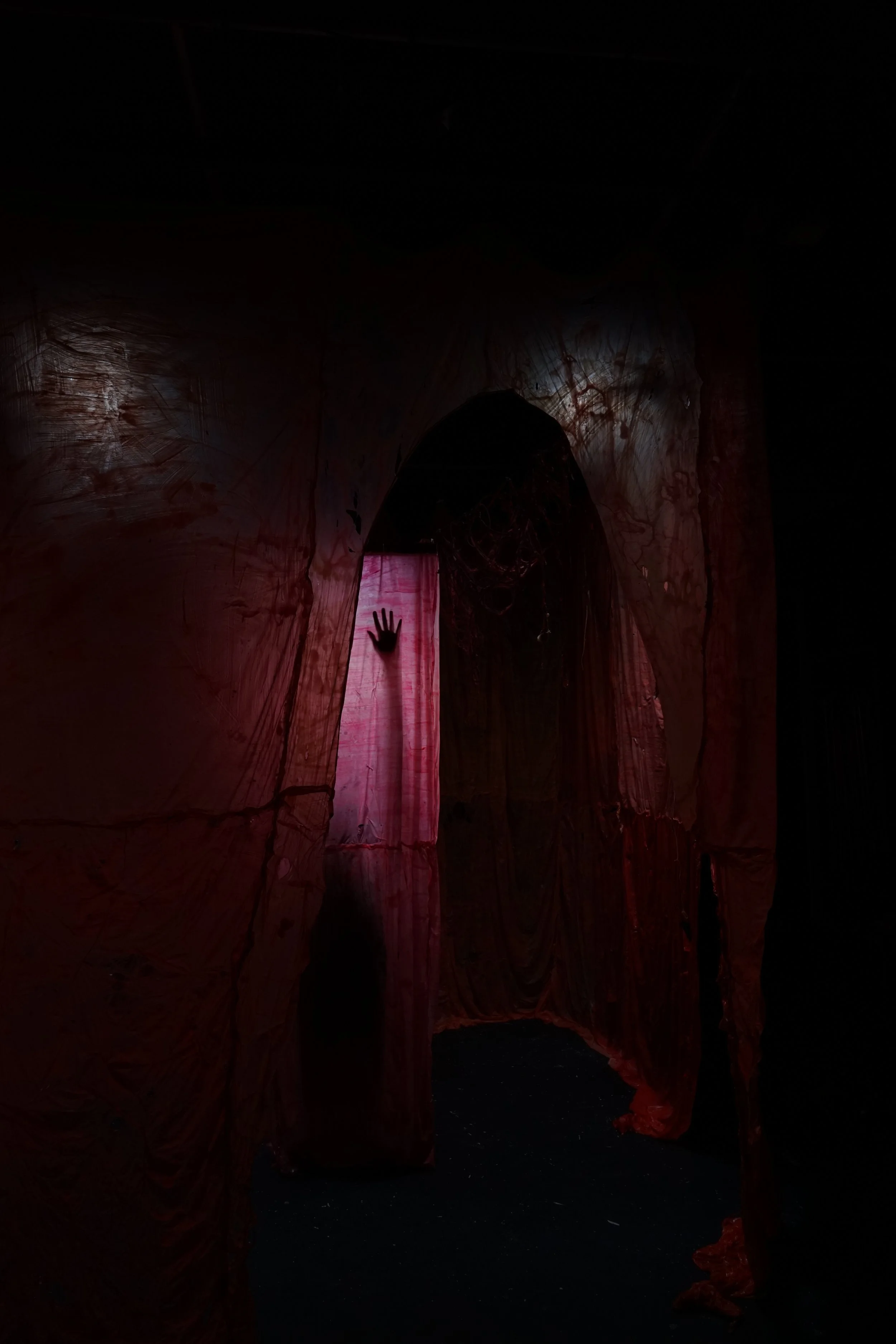 A performer is placed within an inner latex structure and is directed to perform the Catholic ritual of the sign of the cross. However, placed within such a small, suffocating space this ritual becomes frantic and desperate, and the performance develops into a physical state of anxiety, pressure, and pain. The latex structure only reveals the silhouette of the performer, muting their figure, meaning their expression of this experience can only be communicated effectively to the audience through sound. The body of the performer is wired to a contact microphone and distortion pedal set-up so that everything they touch within the structure is met with a loud, jarring sound. The artist Ella Jo Skinner, collaborated with the musician Jack Spittle to create a soundscape that works within the physical boundaries of the installation. Skinner and Spittle recorded a mixture of acoustics, vocals, and basslines whilst locked inside cupboards to emulate the sound of entrapment and isolation. The fragility of the latex or “skin” containing a performer, who sweats and struggles within, perhaps reveals how such a physical and emotional state can be broken through, but our internal anxieties prevent us from doing so, revealing a failure to achieve empathy with others.