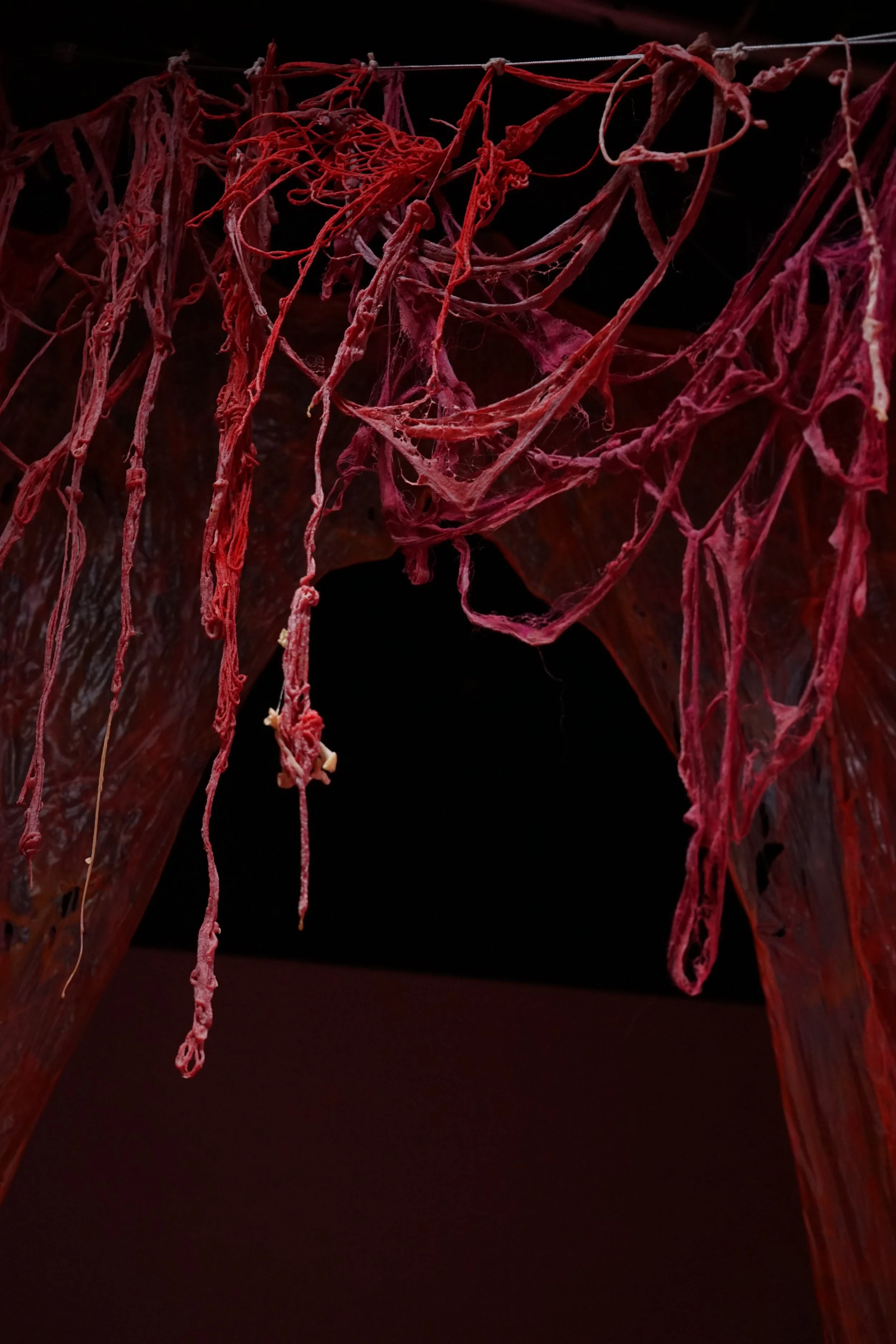 The Box is a sound installation and durational performance composed of latex that was displayed at Holden Gallery, Manchester in 2021. This piece is based on the architectural dimensions of the small apartment artist Ella Jo Skinner was quarantined in during the COVID-19 pandemic. She subverts this architecture by reconstructing the space as flesh, reflecting the inner experience of entrapment and isolation onto an outer, concrete reality.